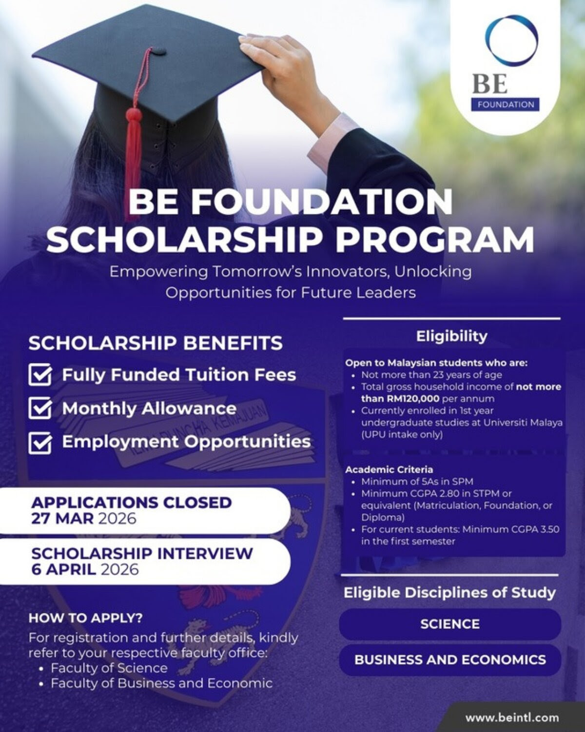 Applications for the BE Foundation Scholarship Program 2026 are now open for eligible Universiti Malaya students.