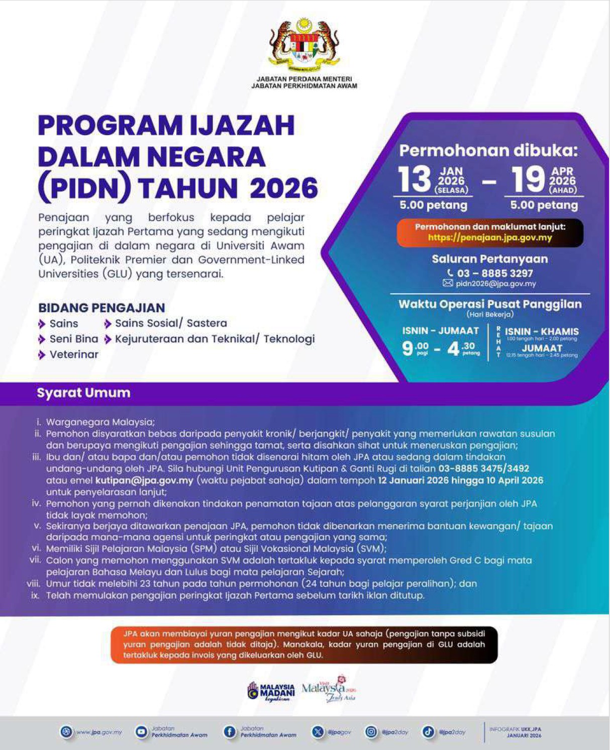 Sukacita dimaklumkan bahawa Jabatan Perkhidmatan Awam (JPA) kini membuka tawaran Program Ijazah Dalam Negara (PIDN) bagi Tahun 2026. Program ini merupakan penajaan berbentuk Pinjaman Boleh Ubah yang berfokus kepada pelajar peringkat Ijazah Pertama yang sedang mengikuti pengajian di dalam negara di Universiti Awam (UA), Politeknik Premier dan Government-Linked Universities (GLU) yang tersenarai.
